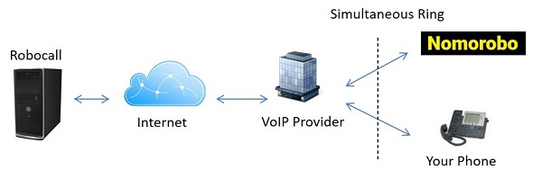 VoIP technology has a feature called simultaneous ring. Most VoIP providers offer this feature and it is a requirement for robocall blocking services such as Nomorobo. Essentially the way this works is that every incoming call will go through the simultaneous ring feature, as shown in Figure 1 below. In addition to ringing your phone it will also ring the robocall blocker service. The robocall blocking service acts very quickly on this call and looks up its extensive database to determine if the caller is on its blacklist. It does this within 1 ring of the phone. If the number is deemed to be bad then the call is handled by the blocking service and your phone will stop ringing. If not then your phone will continue to ring. For this to work always let your phone ring for at least one ring (approximately 5 seconds) before answering a call so the blocking service has time to process.